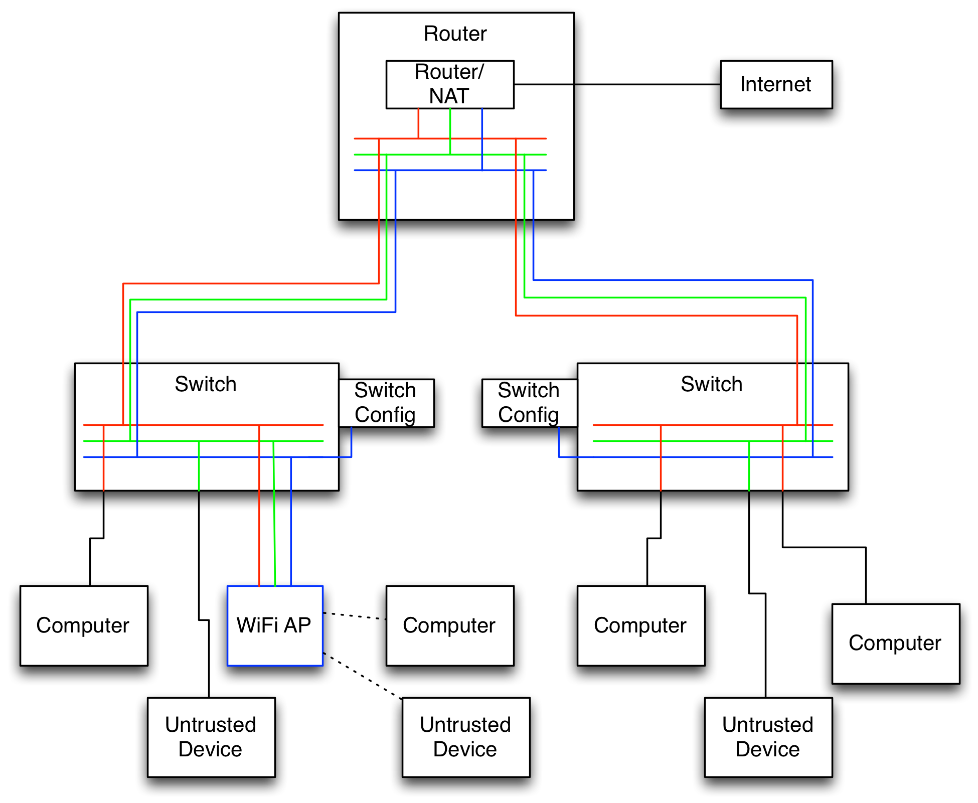I used VLANs for this task since I only have a single ethernet cable running to many physical locations. To accomplish this, I use several Netgear GS108T switches to enforce the separation. These switches are VLAN capable and can enforce the switching. An abbreviated diagram is shown below.